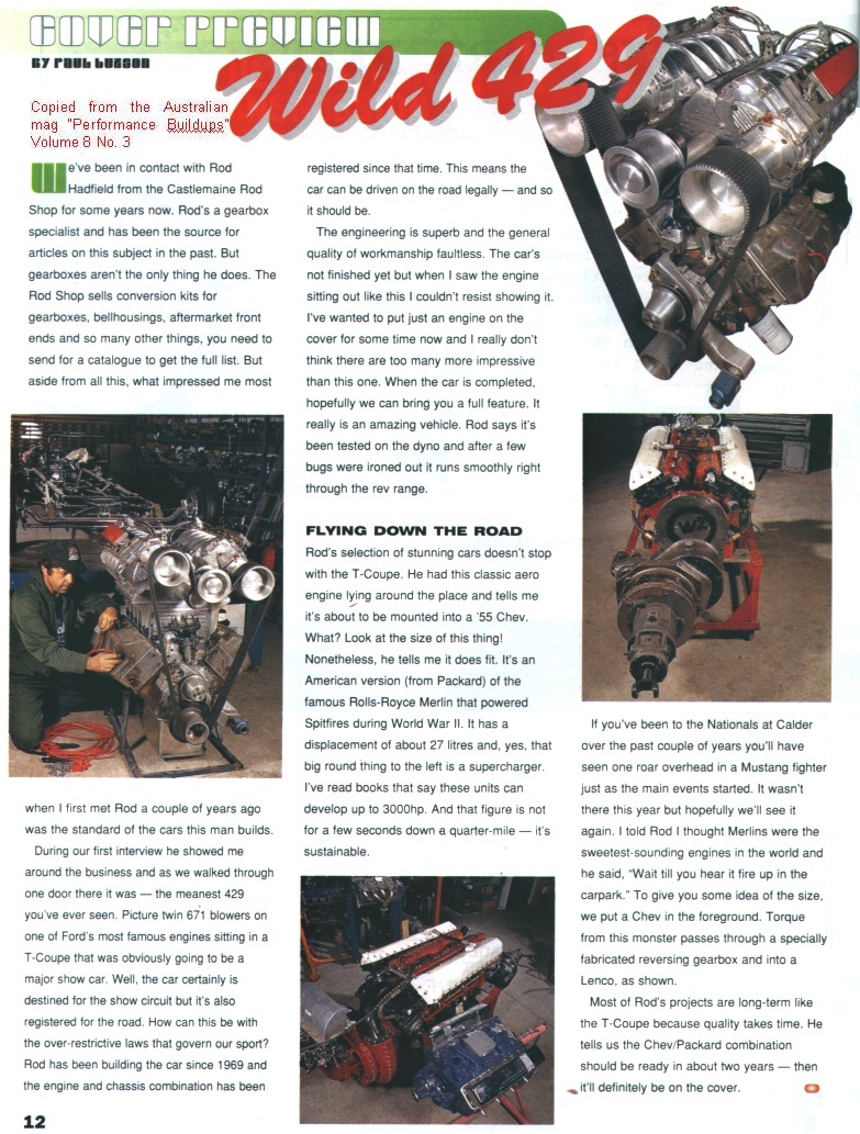 | This extraordinary Boss 429 with 2 blowers and intercooler is the work of Rod Hadfield of Castlemaine, Australia, and was put into a model T Ford Coupe. Pics to come as soon as I can find the mag. Pic links to full-page article, plus Merlin V12 project.