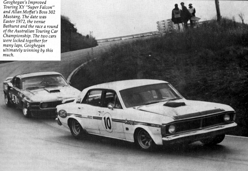 Pete Geoghan's 630bhp Phase III XY GTHO Falcon leads Allan Moffat's Boss 302 Mustang in the Easter 1972 round of the Australian Touring Car Champs, Bathurst, Mt. Panorama, NSW.